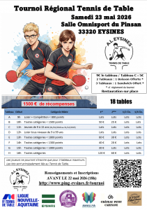 Cette année se déroulera le Samedi 23 mai 2026 le 51ème Tournoi Régional de la section tennis de table de l’Amicale Laïque d’Eysines. Vous pouvez consulter la liste des tableaux avec les lots ici et le règlement ici